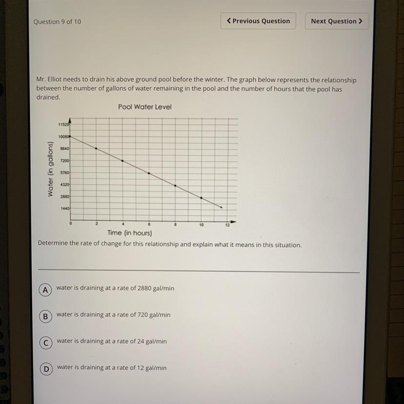 Since we start with 10,080 gallons after 0 minutes pass, we see the next point. Luckily, we are given an exact point of a number between 10,080 and 8640. The difference of those two numbers is 1440, and divide that by 2 to get 720. So we drain 720 per hour. HOWEVER, it says "minutes", so we divide 720 by 60 (hour -> minutes) to get 12.