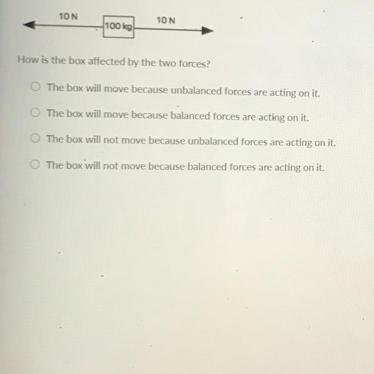 From the image, two forces of equal magnitude of 10 N are pulling the 100 kg box in opposite directions. Since the two forces, 10 N each are pulling the object in opposite directions, they are balanced forces. Therefore, the box will not move because balanced forces are acting on it.
