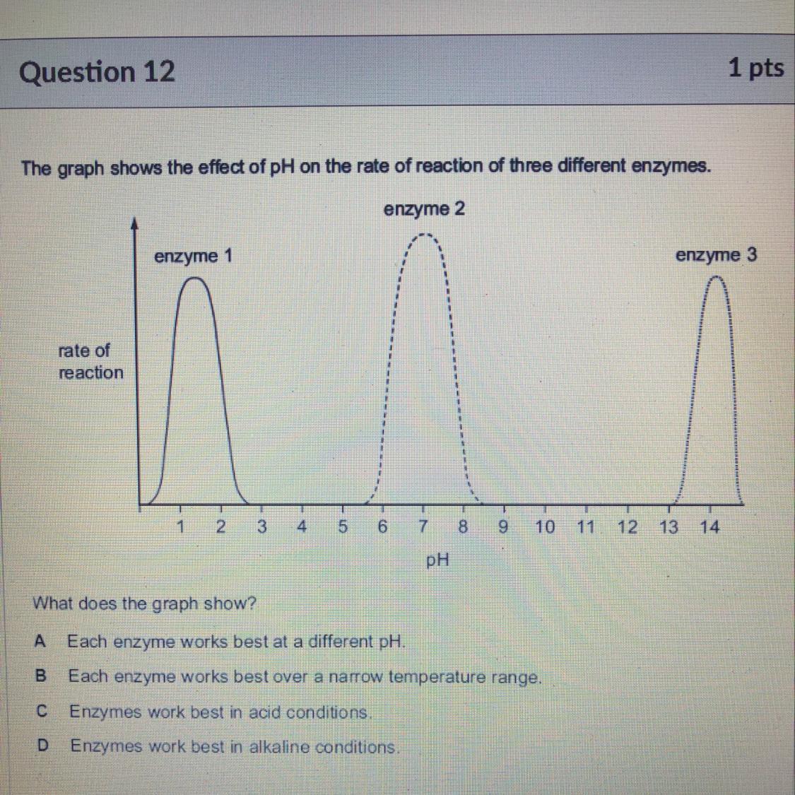 Regarding the effect of pH on the reaction rate of three different enzymes, what the graph shows is that each enzyme works better at different pH (option A).