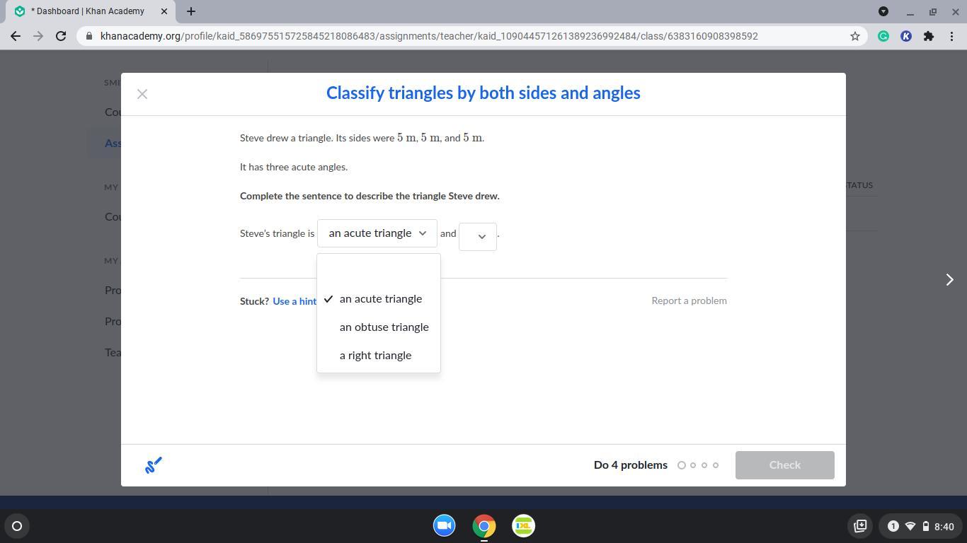 Since the angles are acute, the triangle is acute. And since all sides are equal, the triangle is isosceles. 1) Steve’s triangle is an acute triangle and an isosceles triangle. Hope this helps!