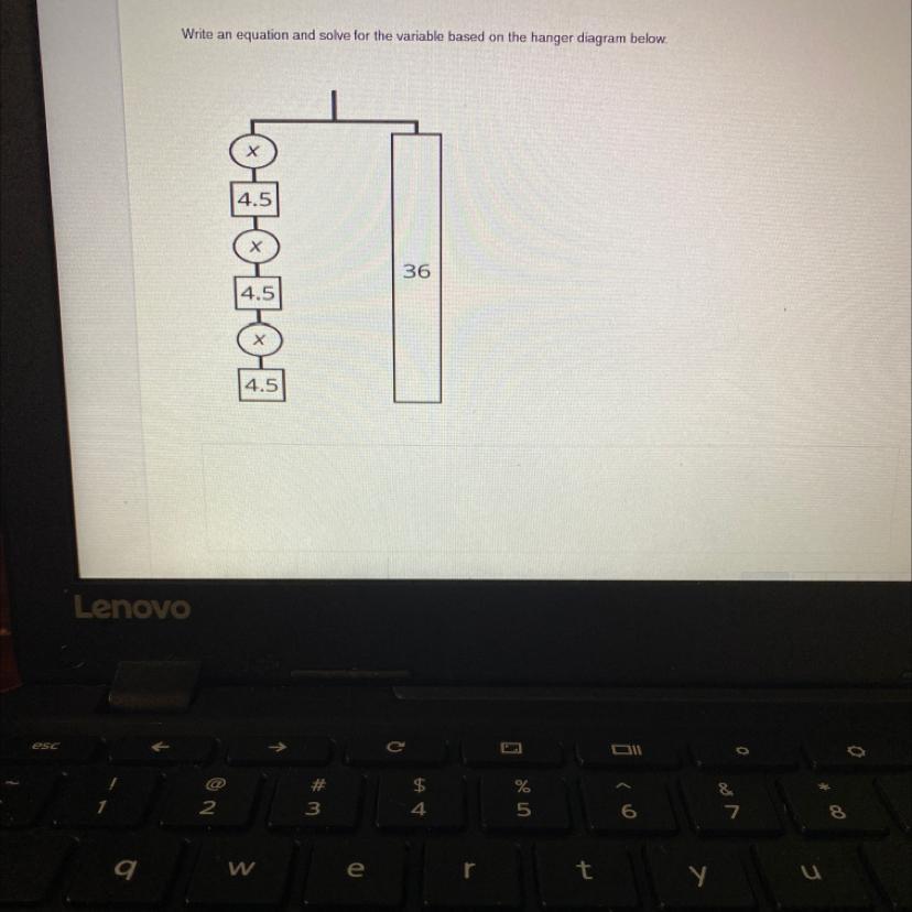 I can try and help, 36 = 3 (4.5 + x), whichif you distribue, you get 36 = 13.5 + 3x, and if you solve from there, you get 22.5 = 3x, then your answer, 7.5 = x