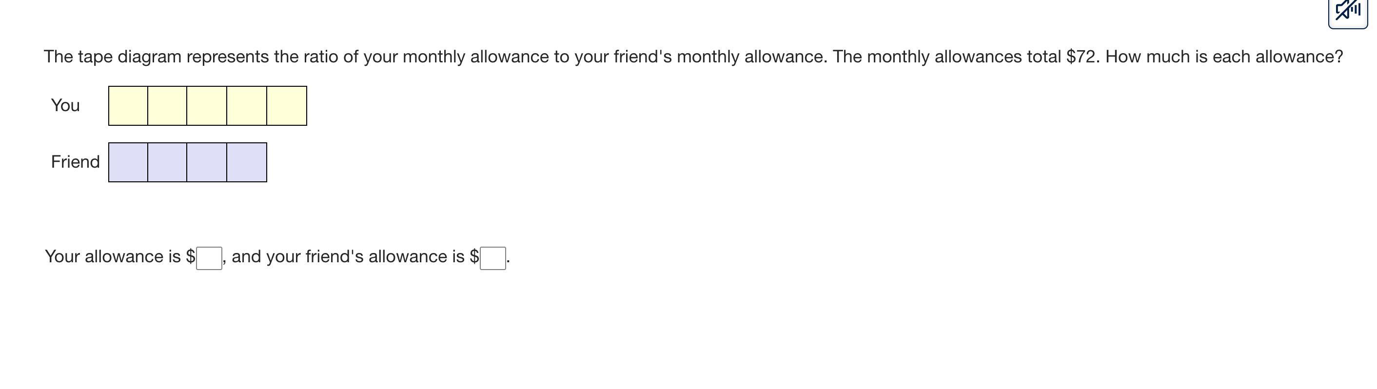 It says that both your friend's monthly allowance and your monthly allowance together is $72. To find out how much one box is worth, we need to divide $72 by 9 because there are 9 boxes. 72 ÷ 9 = 8.