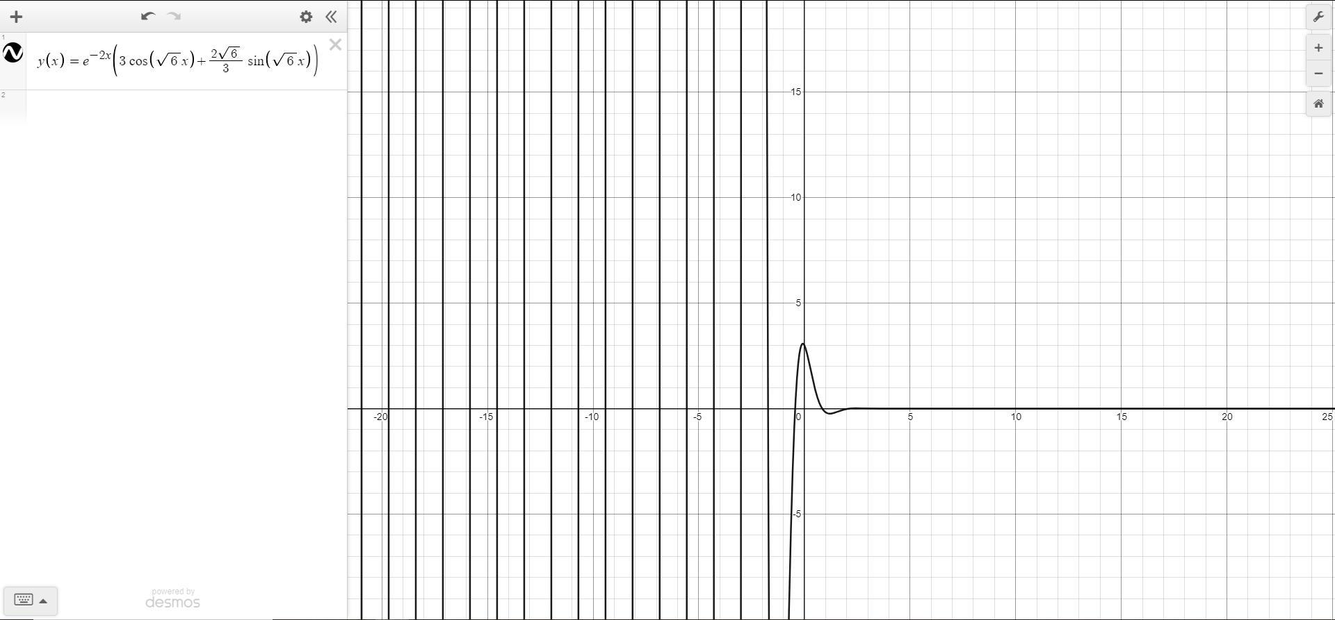 ![y(x)=e^{-2x}[C_1cos(\sqrt{6}x)+C_2sin(\sqrt{6}x)]\\\\y(x)=e^{-2x}[3cos(\sqrt{6}x)+\frac{2\sqrt{6}}{3}sin(\sqrt{6}x)]](https://tex.z-dn.net/?f=y%28x%29%3De%5E%7B-2x%7D%5BC_1cos%28%5Csqrt%7B6%7Dx%29%2BC_2sin%28%5Csqrt%7B6%7Dx%29%5D%5C%5C%5C%5Cy%28x%29%3De%5E%7B-2x%7D%5B3cos%28%5Csqrt%7B6%7Dx%29%2B%5Cfrac%7B2%5Csqrt%7B6%7D%7D%7B3%7Dsin%28%5Csqrt%7B6%7Dx%29%5D)