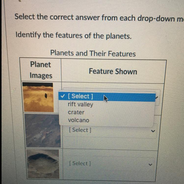 I'm pretty sure the first one is not a crater lol. The last one is a crater, the second one I think is a rift valley, and the first one volcano. Not sure tho as the image is not that clear but the last one is a crater.