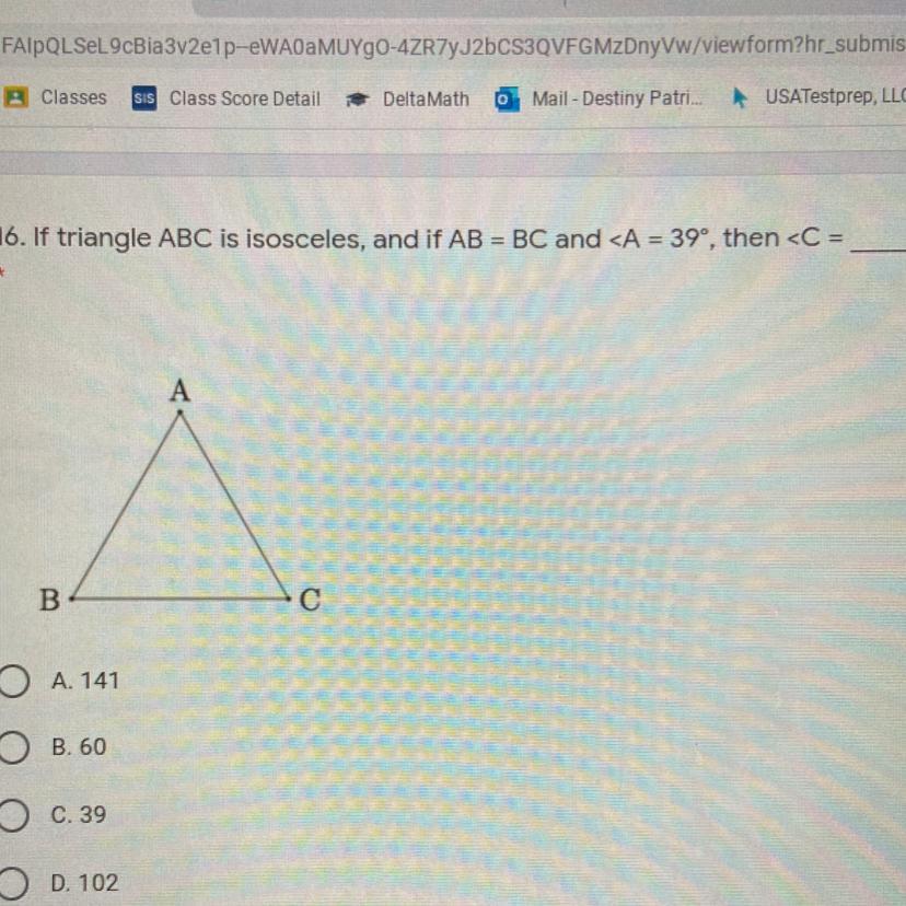 If angle A = 39, then the angle C is equal to A. This may seem like a weird question, but it’s the way that the triangle is positioned.