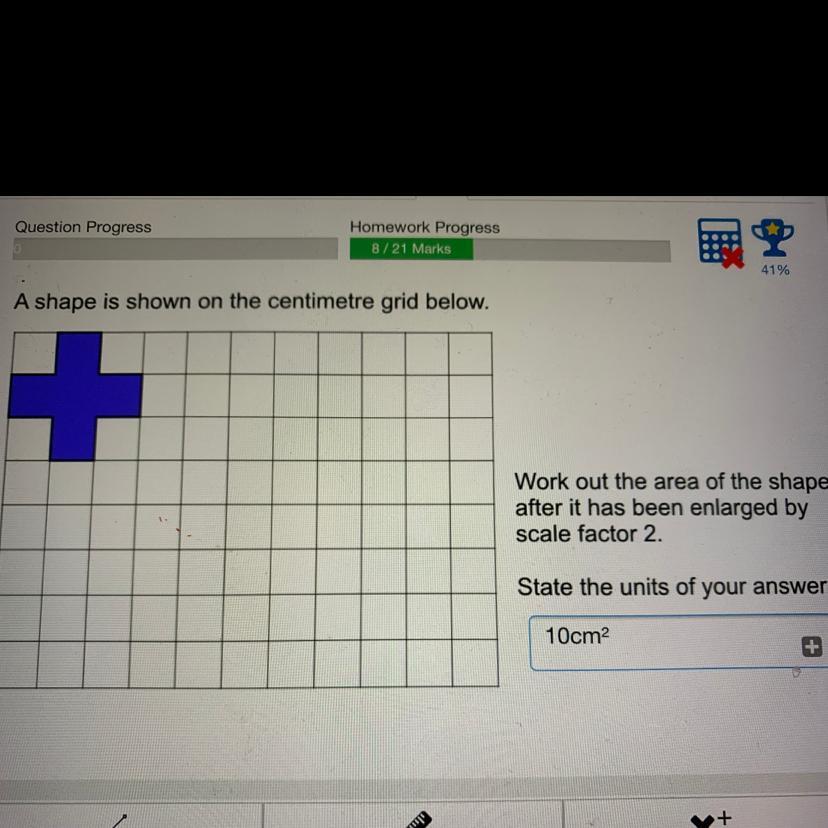 if each scale has been enlarged by 2 then 2x2=4 each square is 4cm², there are 5 squares