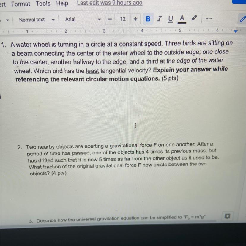 1. Tangential velocity is v=w*d (in m/s), where w is the rotational speed, commonly denoted as the letter omega (in radians per second). d is the distance from the center of the rotating object to the position of where you would like to calculate the velocity (in meters).
