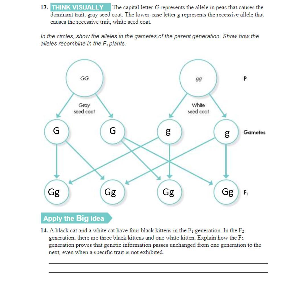 The F1 generation has to inherit one allele from each parent. They have to inherit a G from the gray seed coat parent, and they have to inherit a g from the white seed coat parent. This means all the offspring will be heterozygous Gg. Because we know G is dominant, they will all have a gray seed coat.