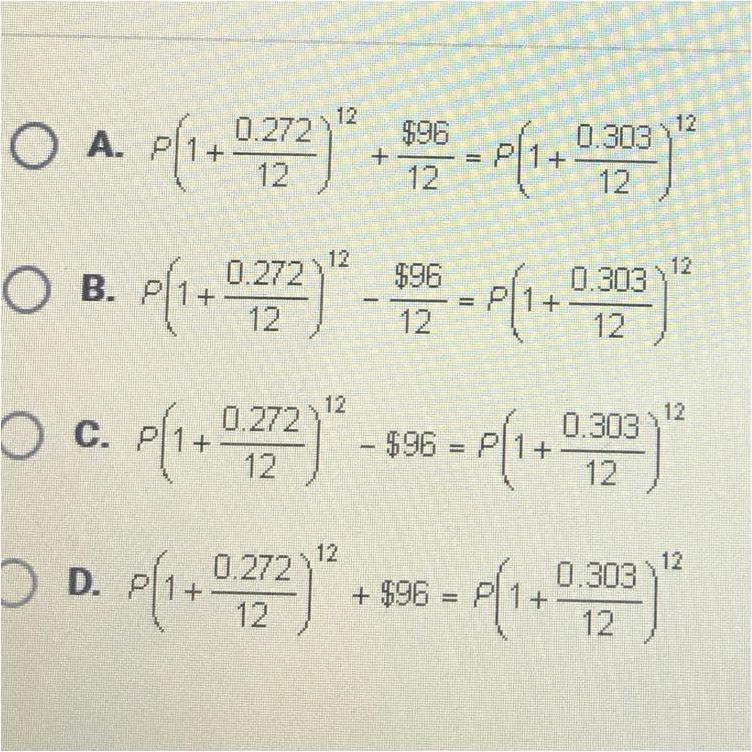 Answer: D. P * (1 + 0.272/12)¹² + 96 = P * (1 + 0.303/12)¹²