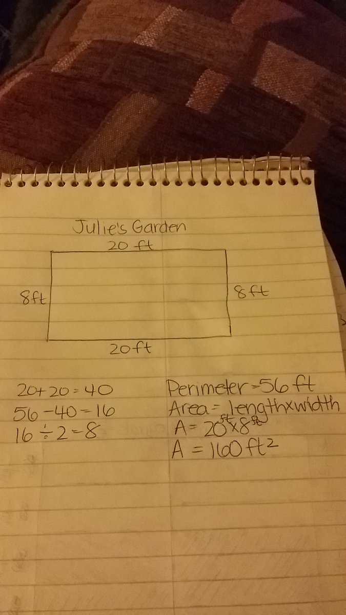 Julie planted a rectangular garden that is 20 feet long. She placed 56 feet of fencing around her garden. Draw and label a sketc