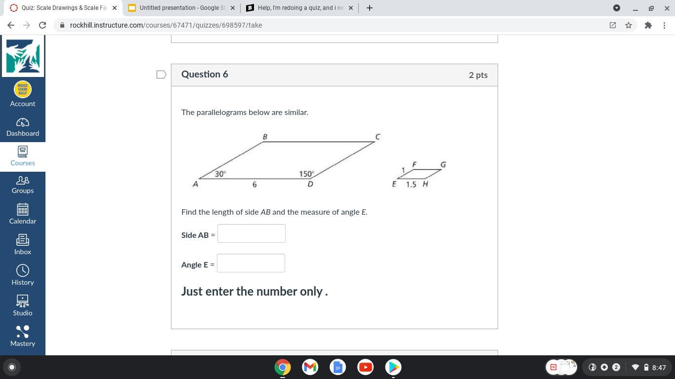 The question says that the parallelograms are similar, so the angles should not change between the 2 shapes.