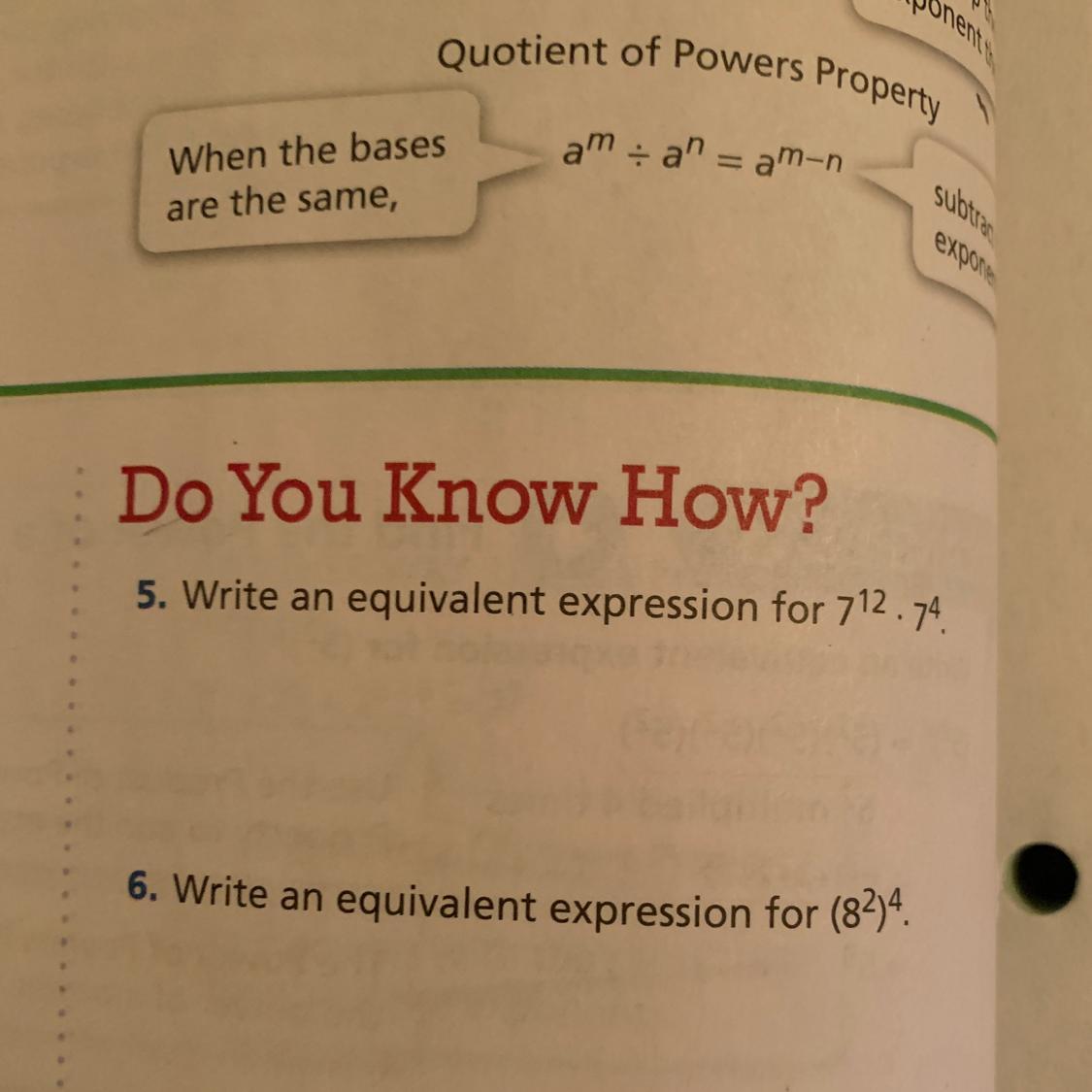 PEMDAS requires parenthesis first, then exponents, then multiplication/division, and then addition/subtraction. For 5, lets find 7¹². According to my calculations, that is 13,841,287,201. Now for 7⁴. According to my calculations, that is 2,401. Now, we have 13,841,287,201 x 2,401. In math, an expression is a problem. If I solve it, it wouldn't be an expression, so I'll just leave it at that. For 6, we do the parenthesis first. 8² is 64. 64 to the fourth power is 16,777,216. If I solved it, it wouldn't be an expression, so we have to leave it at 64⁴. If you are wondering, 64⁴ is equal to 16,777,216. I hope this helps!