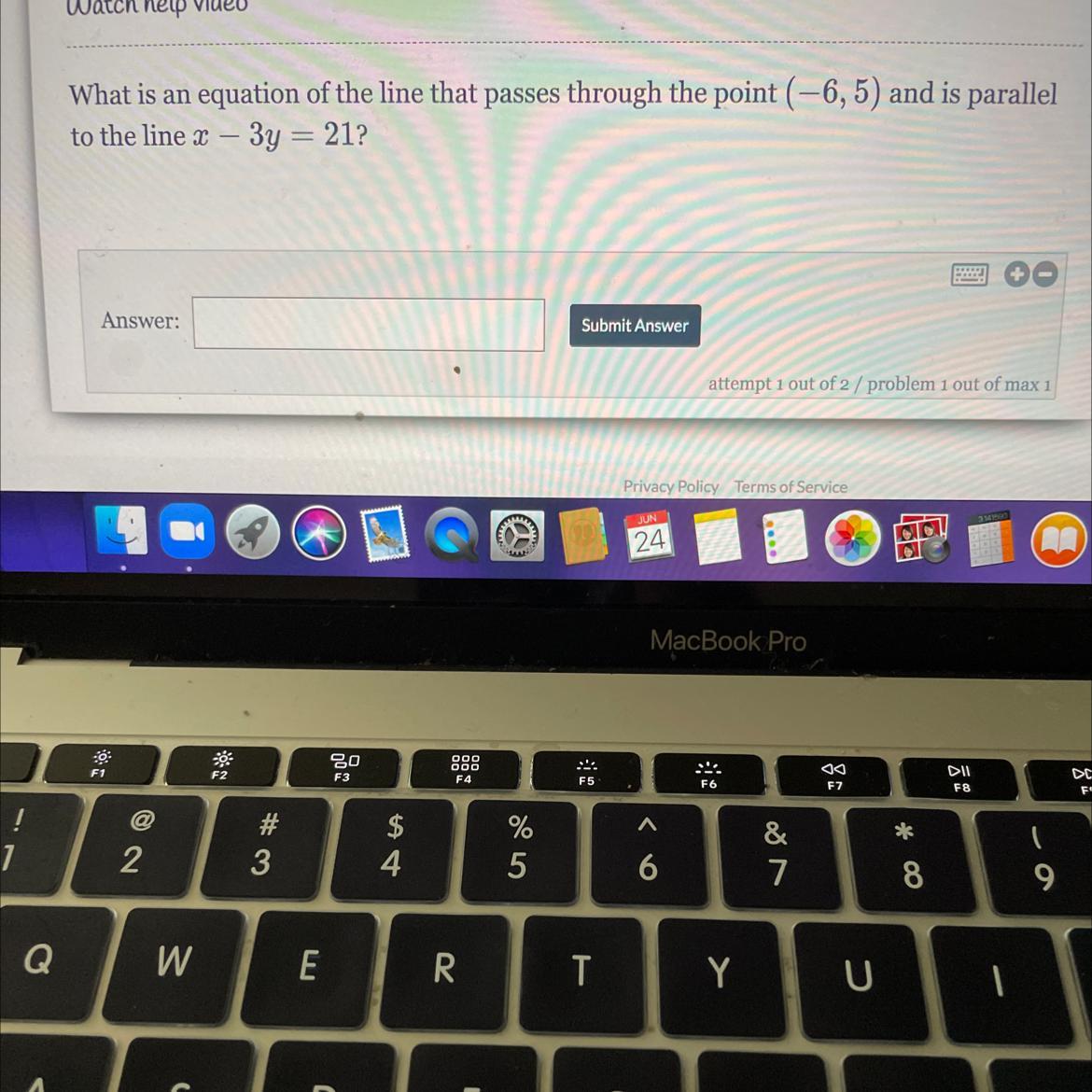 We're given the equation x-3y=21 and we want to find the equation of the line parallel to x-3y=21 that passes through (-6,5)