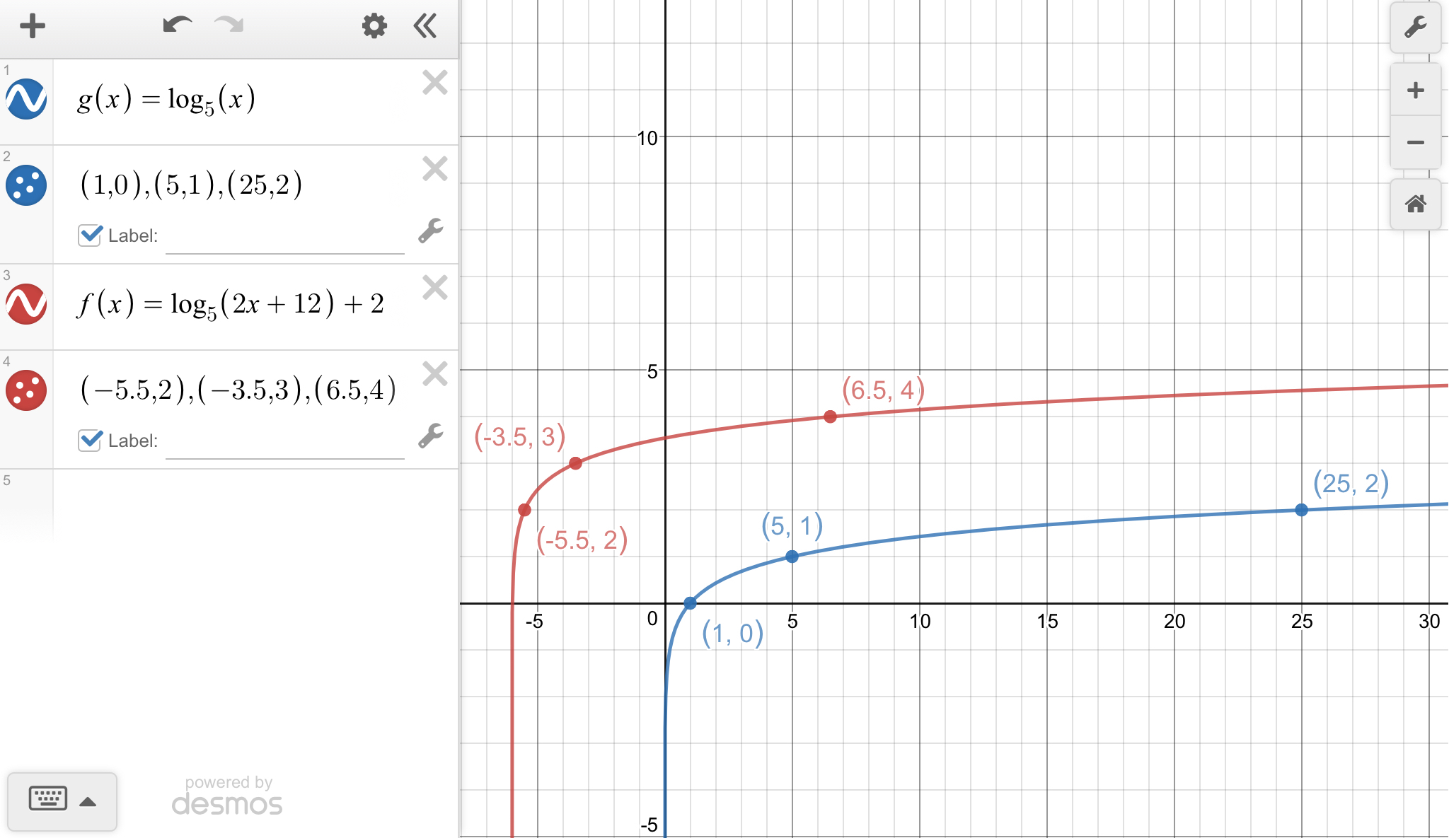 Let's call the parent function g(x) = log₅(x), which has a vertical asymptote at x=0, and goes through the points (1, 0), (5, 1), (25, 2).