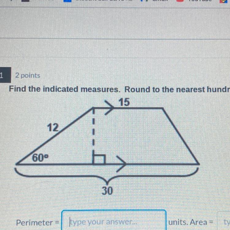 <u>(Area)</u> The first step in finding the area of this trapezoid is identifying its height. You can find the height of the trapezoid by using sin with the given angle and hypotenuse of the right triangle in the figure (sin x° = opposite leg/hypotenuse):