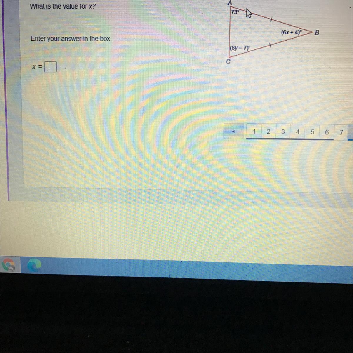 since this is an isosceles triangle, this means that the two base angles are equal. therefore, 8y-7=73°, meaning that y = 10° (although we don't really need to know that since you're just supposed to find x).