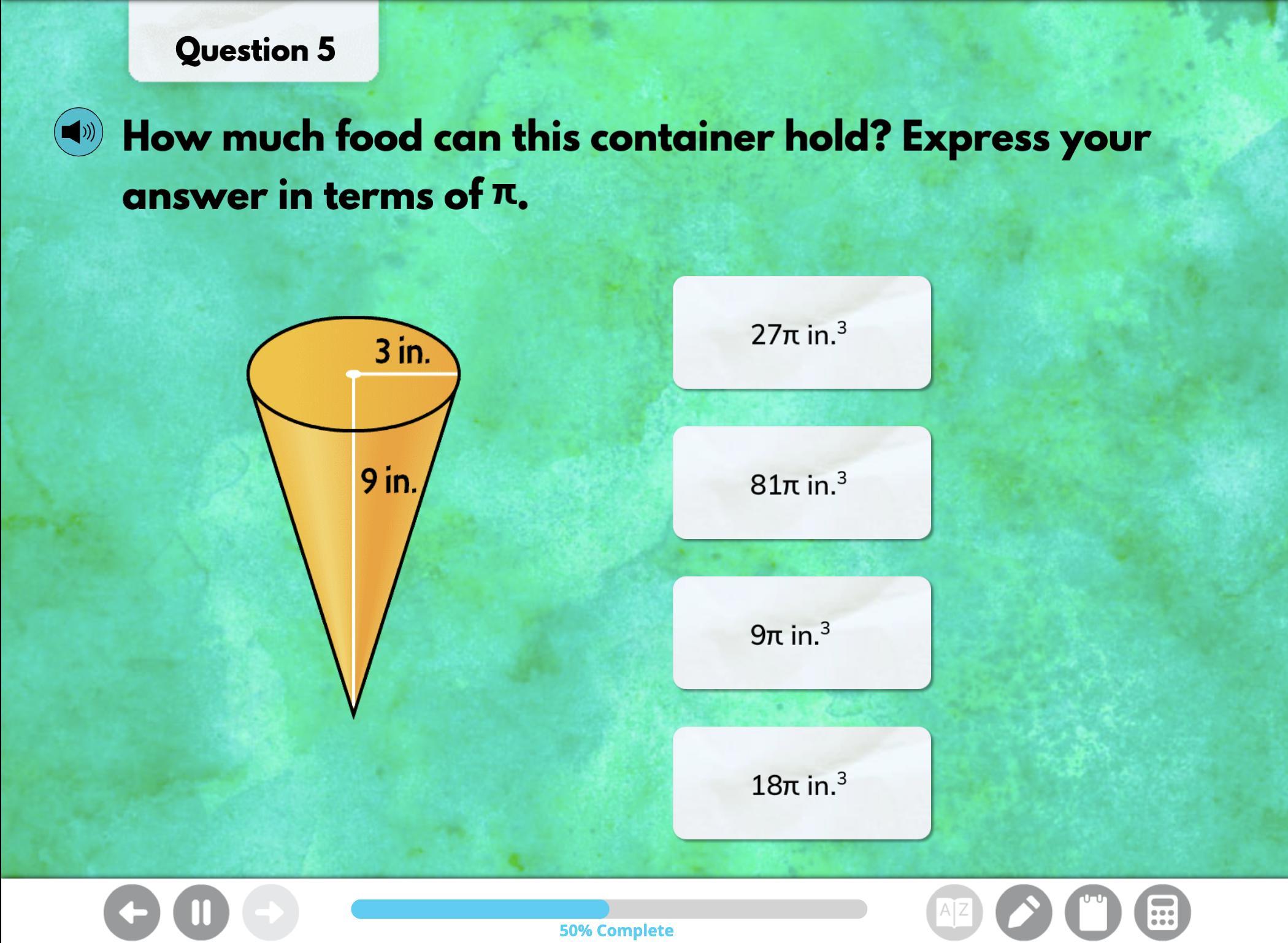\frac{1}{3}  \times {3}^{2}  \times 9 \times \pi \\  = 27\pi