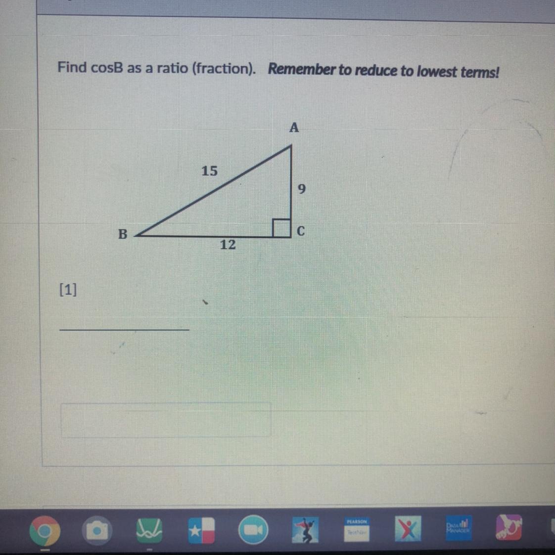 I just looked up how to do this since I've never done it before, so if I'm wrong I'm sorry, but from what I found all you have to do is put the opposite(o) over the hypotenuse(h) o/h which would be 9/15 and simplified it would be 3/5, and again if I'm wrong I'm sorry.