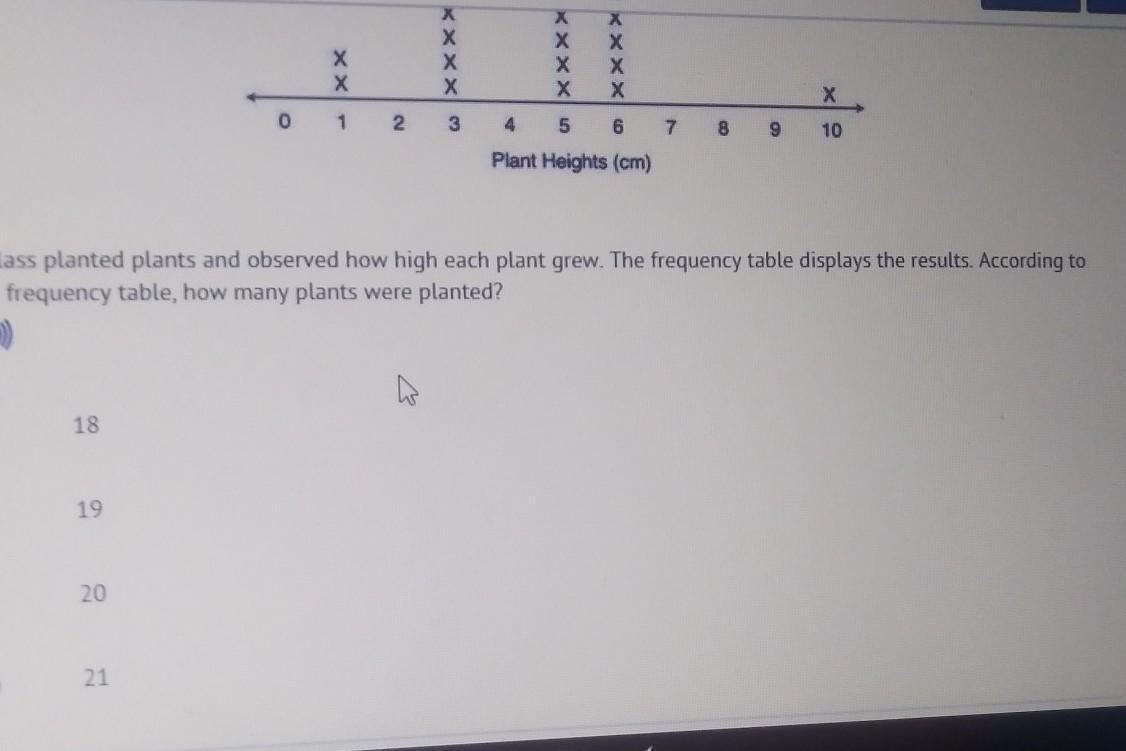 isplays the results. Accord the frequency table, how many plants were planted? A) 18 B) 19 C) 20 D) 21