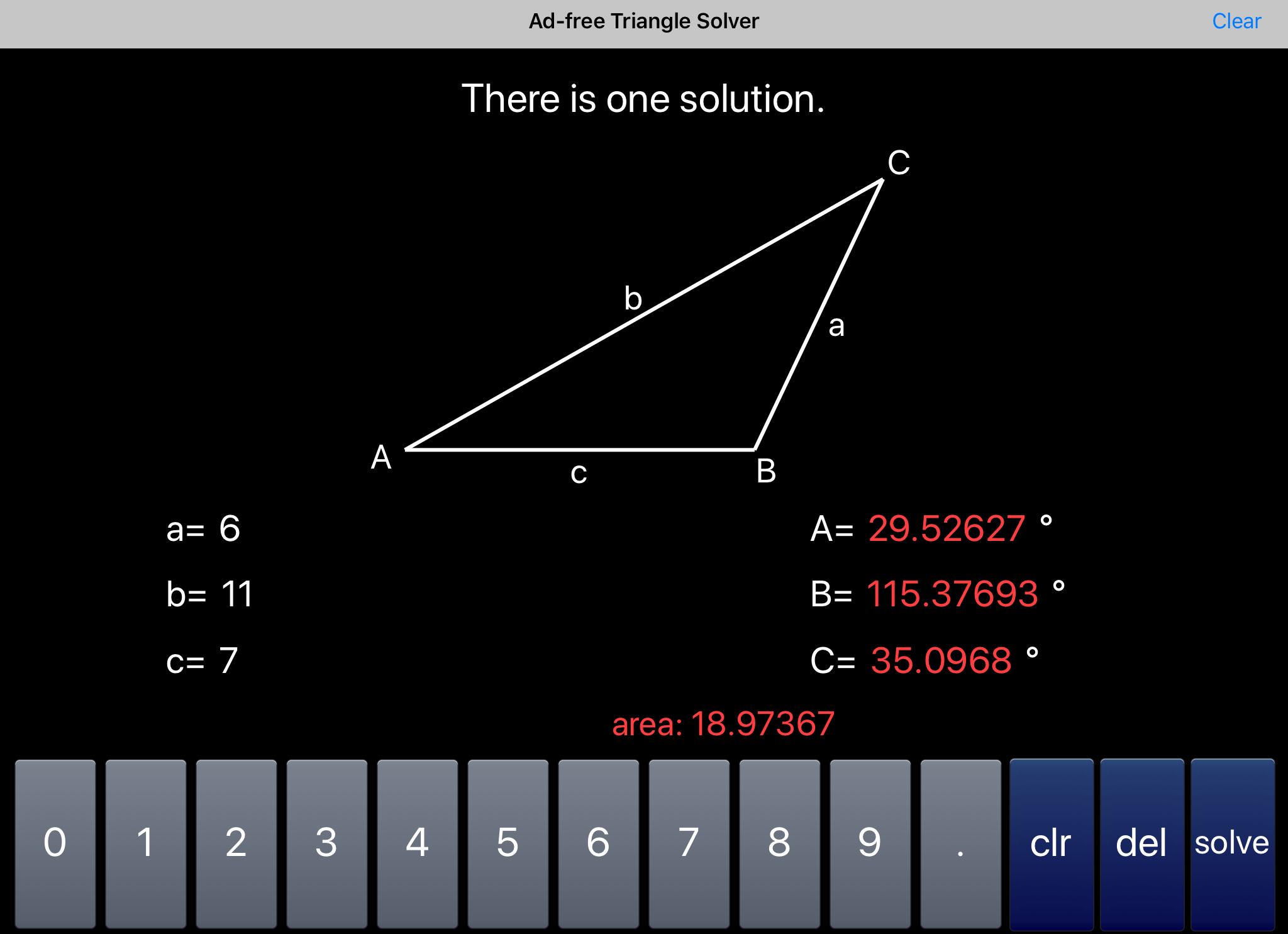 B = arccos((6² + 7² - 11²)/(2·6·7))