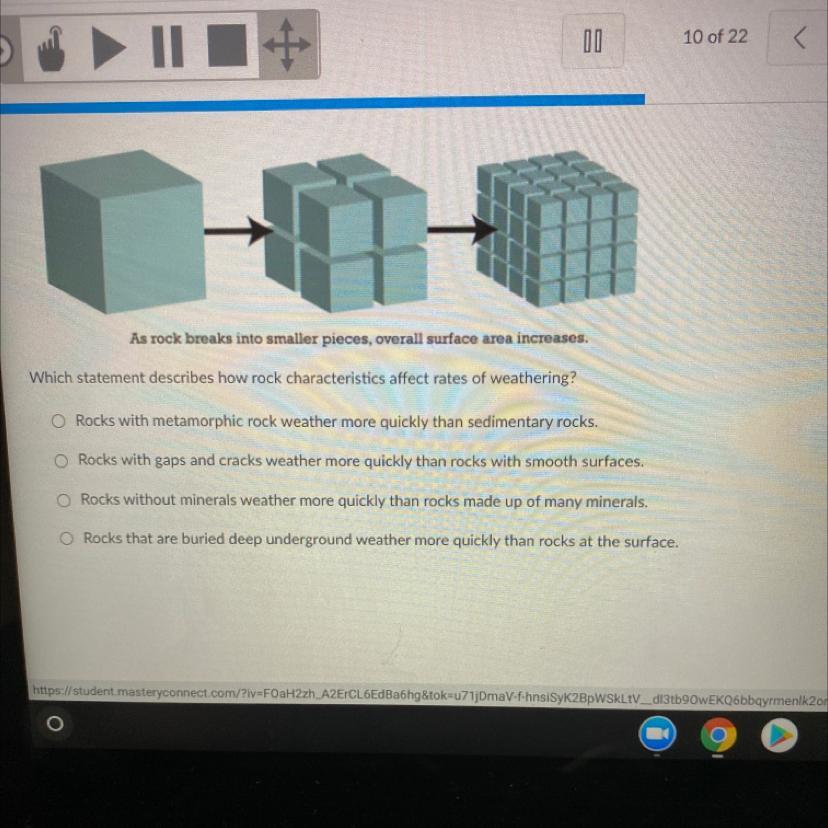 Rocks with GAPS AND CRACKS weather more quickly than rocks with smooth surfaces. Rocks without minerals more quickly than rocks MADE UP of many minerals.