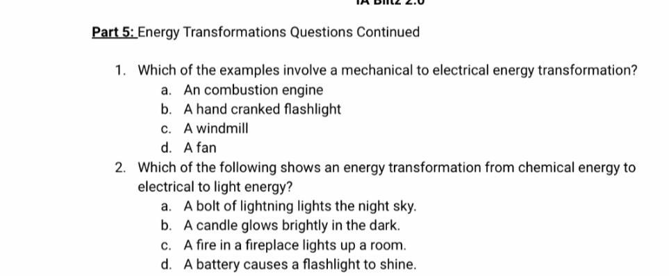 It is this because a flashlight being cranked up to work is meachanical and electrical. A battery being put into a flashlight is giving it electrical energy and chemical energy is inside of the battery. I hope this helps !
