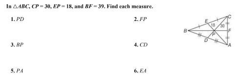 So my best guess would be, PD = 18, BP= 30, FP = 19.5 (because that's half of 39 and it's basically the same length as BF). PA = 30, and CD = 39(?)