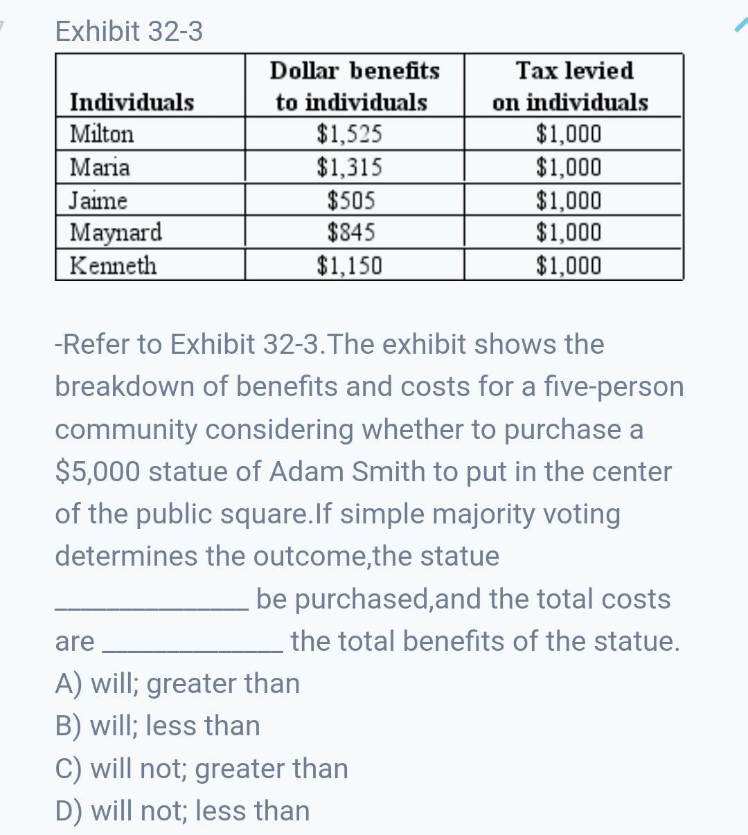 The exhibit shows the breakdown of benefits and costs for a five-person community considering whether to purchase a $5,000 statue of Adam Smith to put in the center of the public square. If simple majority voting determines the outcome, the statue will be purchased, and the total costs are less than the total benefits of the statue.