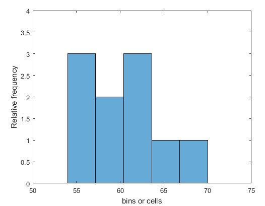 The first bin has a range of [55, 58]. Its relative frequency is 3, which means that 3 students have heights within the range [55,58] inches.