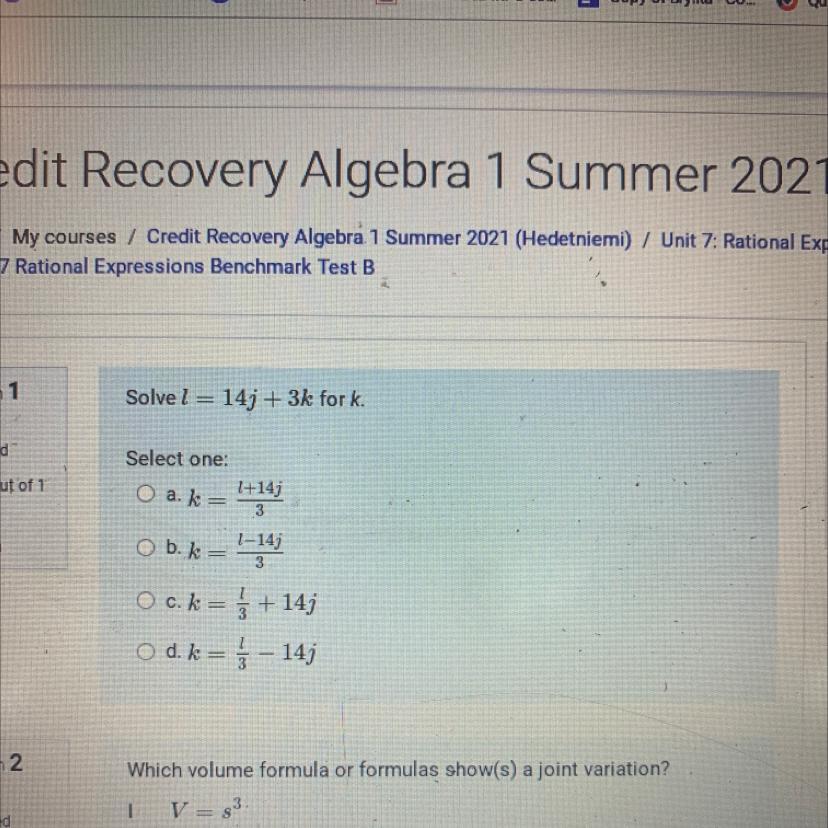 b.    \blue{k = \dfrac{l - 14j}{3}}
