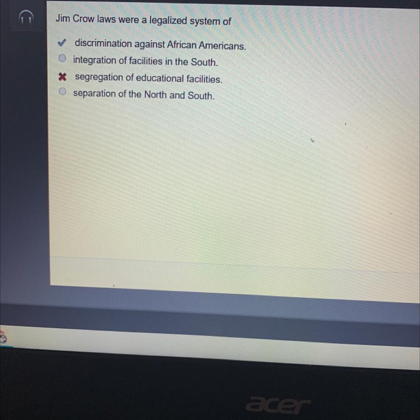 Explanation: Quoting Wikipedia, "Jim Crow laws were state and local laws that enforced racial segregation in the Southern United States. These laws were enacted in the late 19th and early 20th centuries by white Southern Democrat-dominated state legislatures to disenfranchise and remove political and economic gains made by black people during the Reconstruction period. Jim Crow laws were enforced until 1965.