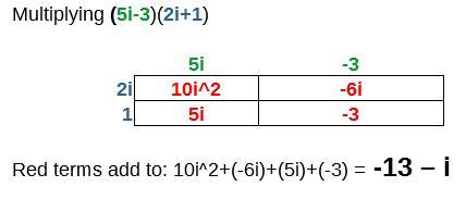 Each of the 4 red terms in the boxes represents the result of multiplying the outer blue and green terms. Example: 5i times 2i = 10i^2 in row1, column1.