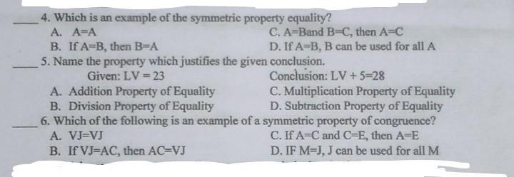 6. Symmetric property: if VJ ≅ AC, then AC ≅ VJ