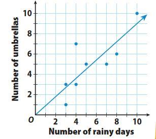 The scatter plot and trend line show the relationship between the number of rainy days in a month and the number of umbrellas so