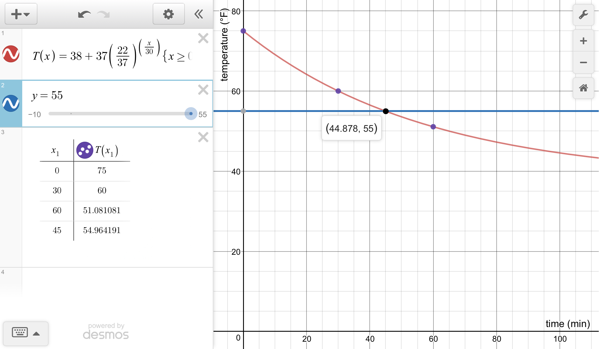 T(t) = 55 = 38 +37·(22/37)^(t/30)