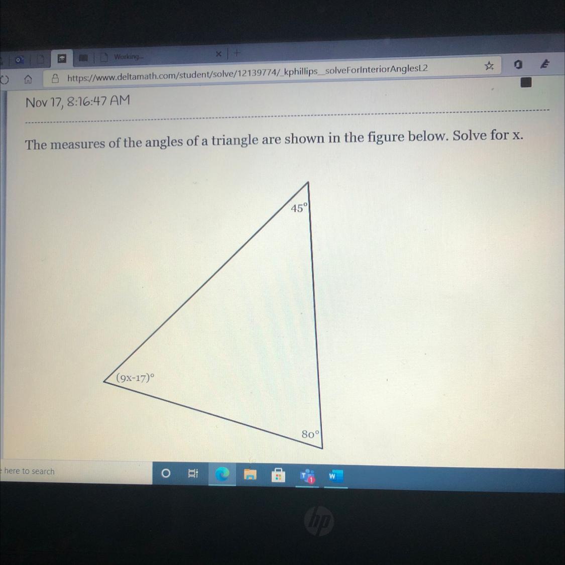 Sin(angle) = 5/7. Using a calculator, this angle is thus 45.6, or approximately 46 degrees.