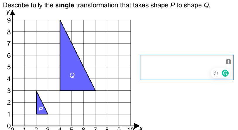 The single transformation that takes shape 'p' onto shape 'q' is a dilation by a scale factor of 3 with the center point (1, 0)