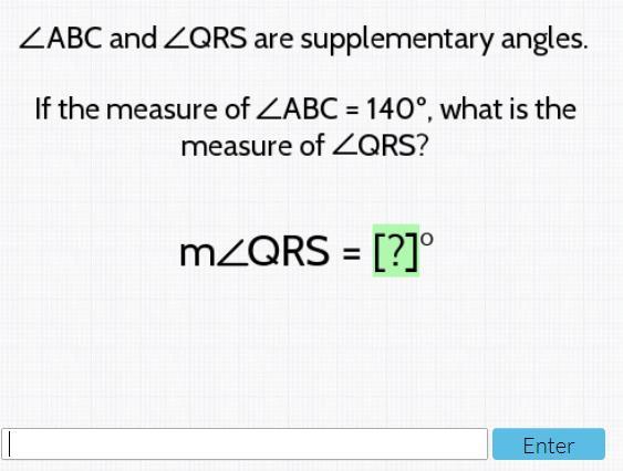 Supplementary angles are 180 degrees therefore if angle ABC is 140 degrees that would mean that angle QRS has to be 40 degrees.