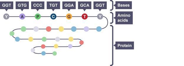 The sequence of bases in a DNA molecule can determine the order of amino acids in a protein molecule. Groups of three bases called triplets represent different amino acids. This is the basis of the genetic code . A sequence of bases (genetic information) on DNA that codes for a protein is called a gene .
