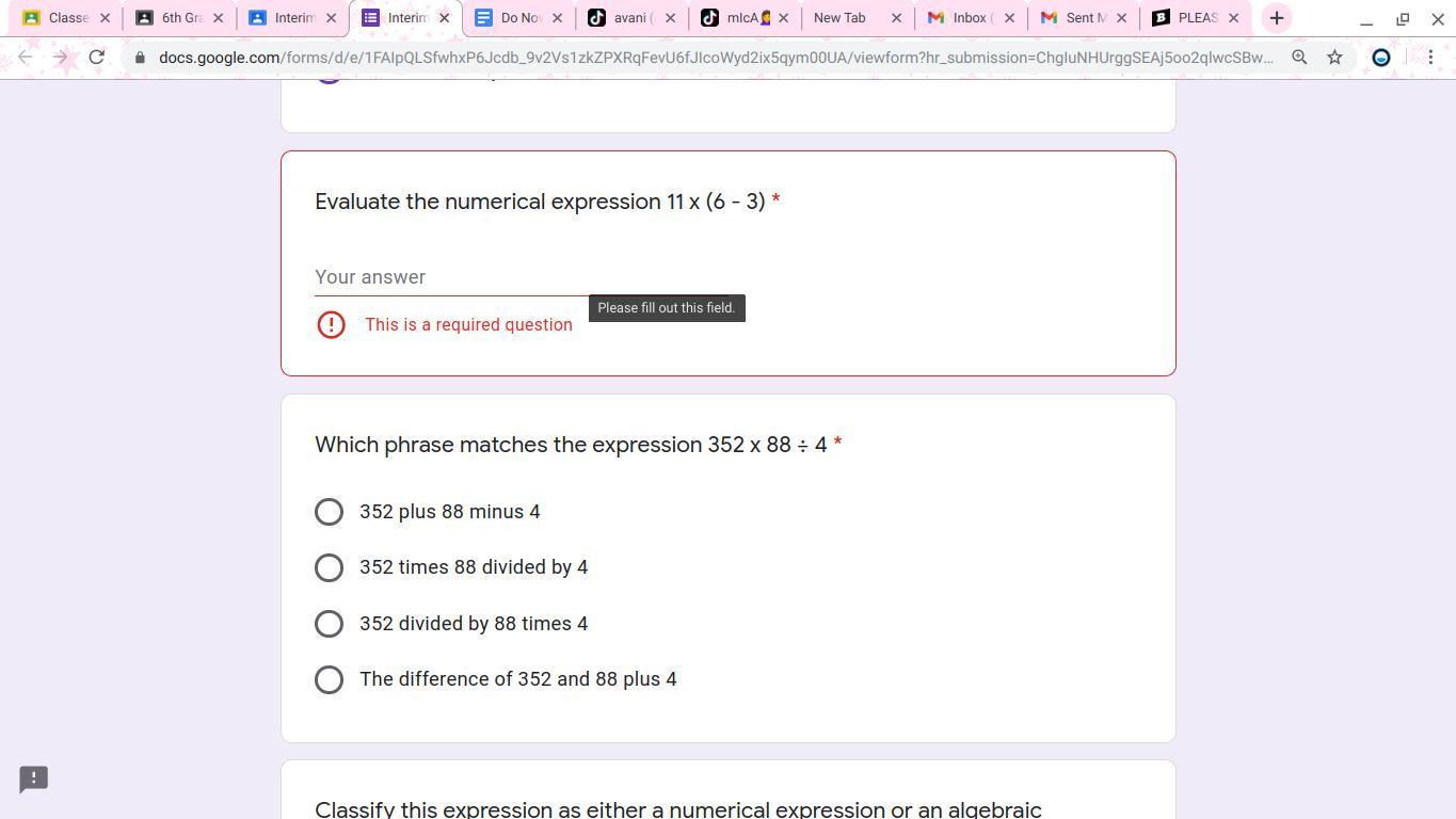 Answer: First Answer, 6 - 3 = 3 11 x 3 = 33 that's your answer!