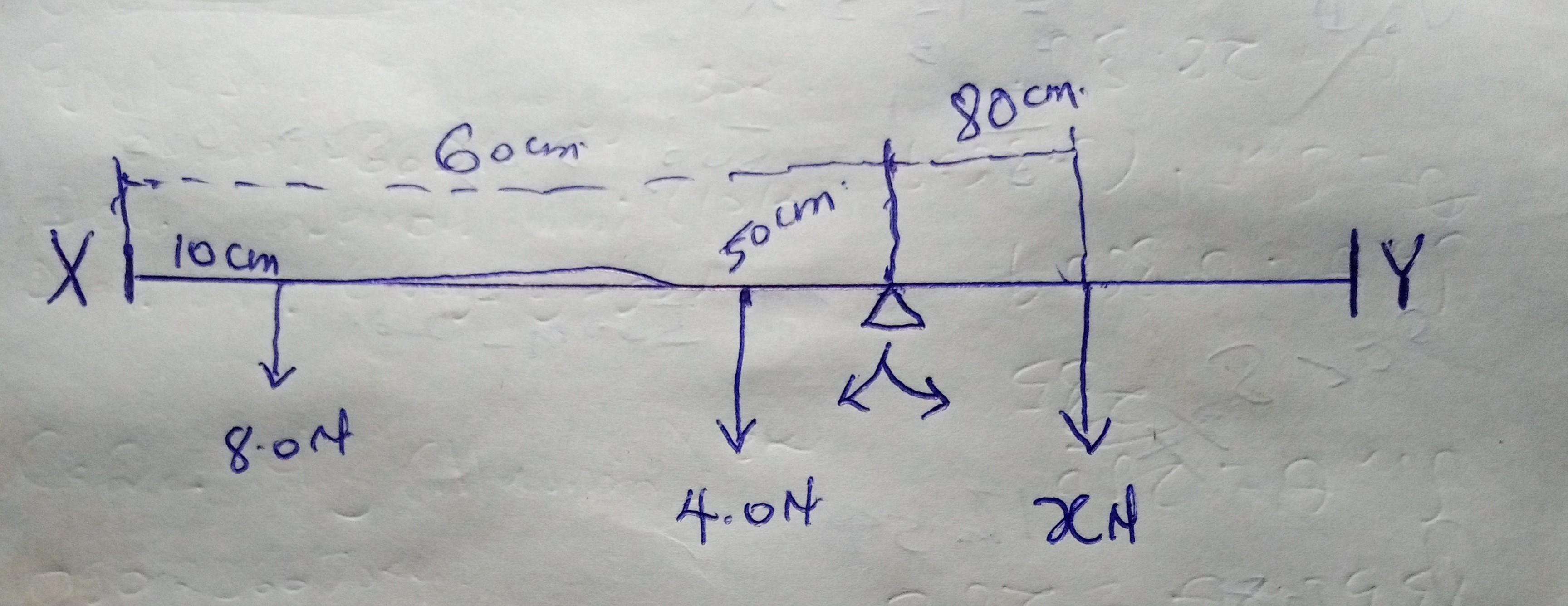 A uniform beam XY is 100 cm long and weighs 4.0N.The beam rests on a pivot 60 cm from end X. A load of 8.0 N hangs from the beam
