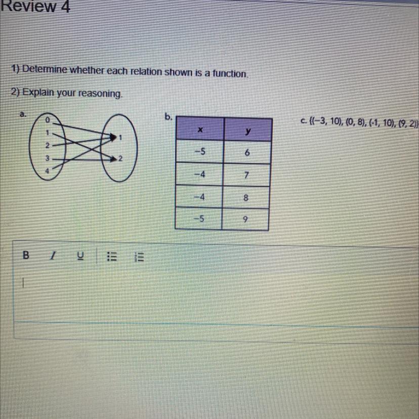 For choice B, -4 is paired with both 7 and 8 so it is not a function.