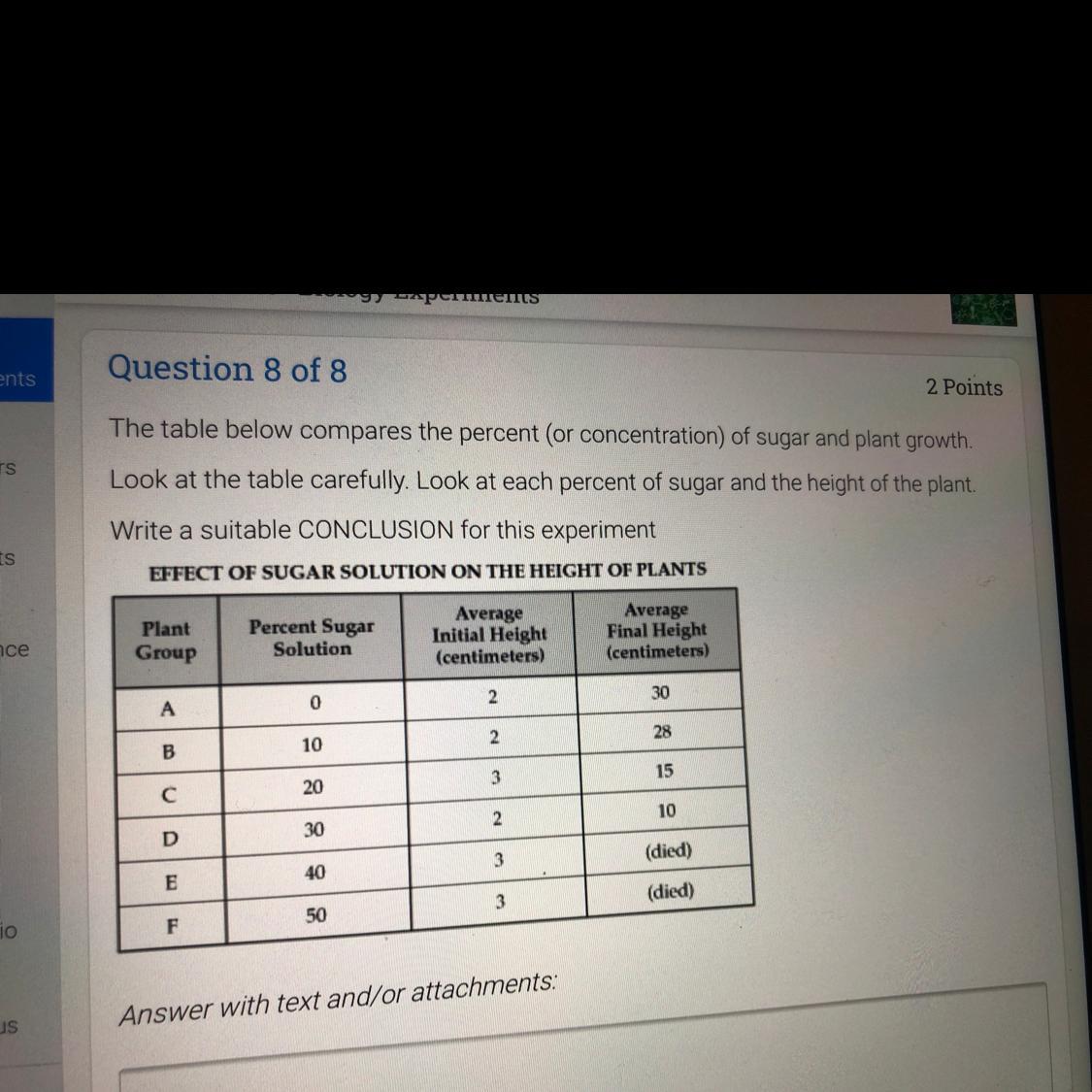As soon as the concentration passed 39, the plants died. Adding to that, I have also found out that the lower the concentration of the sugar, the more the average height becomes.