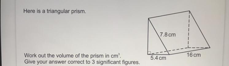 volume of the prism = 1/2 x 5.4 x 5.6285 x 16 = 243cm^3 (3s.f.)
