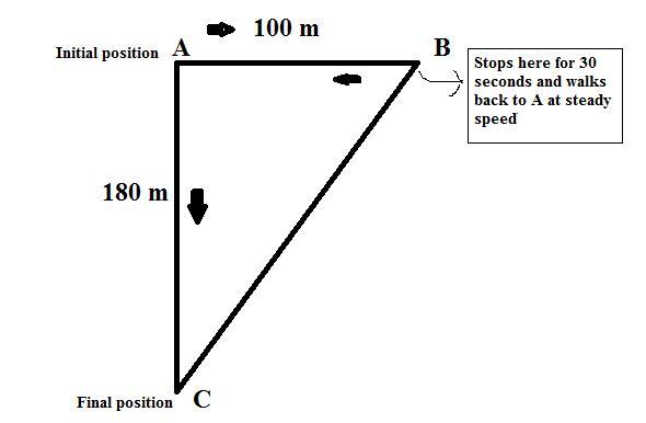 After , 30 seconds he he comes back to his initial position that is A with steady speed of 1.00 m/s.