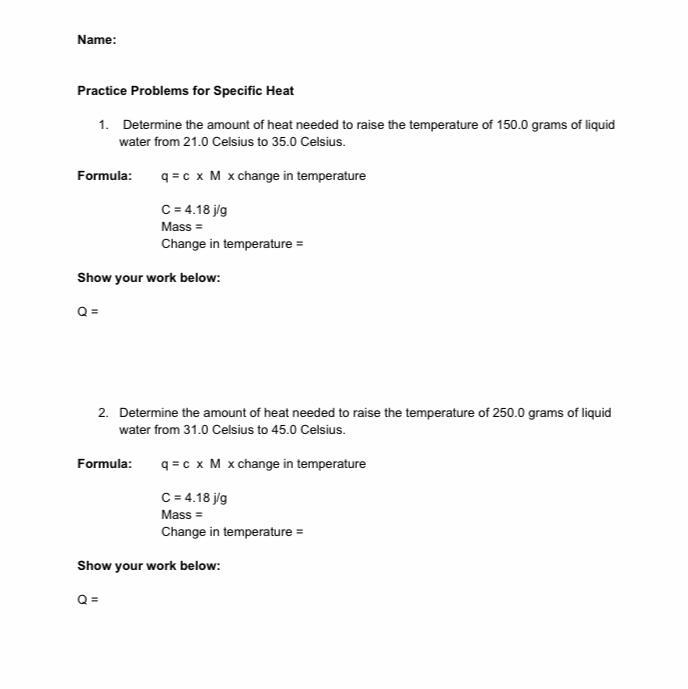 Problem 1: Amount of heat needed to heat 150 grams water from 21.0 to 35.0 Celcius.