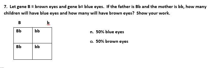 Imagine a mom with one version of the brown and one version of the blue eye color gene. She is Bb and has brown eyes. Dad is bb and has blue eyes.