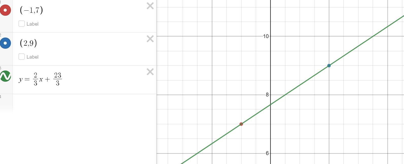 Determine the slope of the line that passes through the points (-1,7) and (2,9)