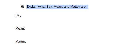 Say, Mean and Matter are the Three questions strategy to help you answer a text. by analyzing a text by asking yourself those three questions. Basically: What does it literally say, What are the meanings and whys, and why does the text even matter.