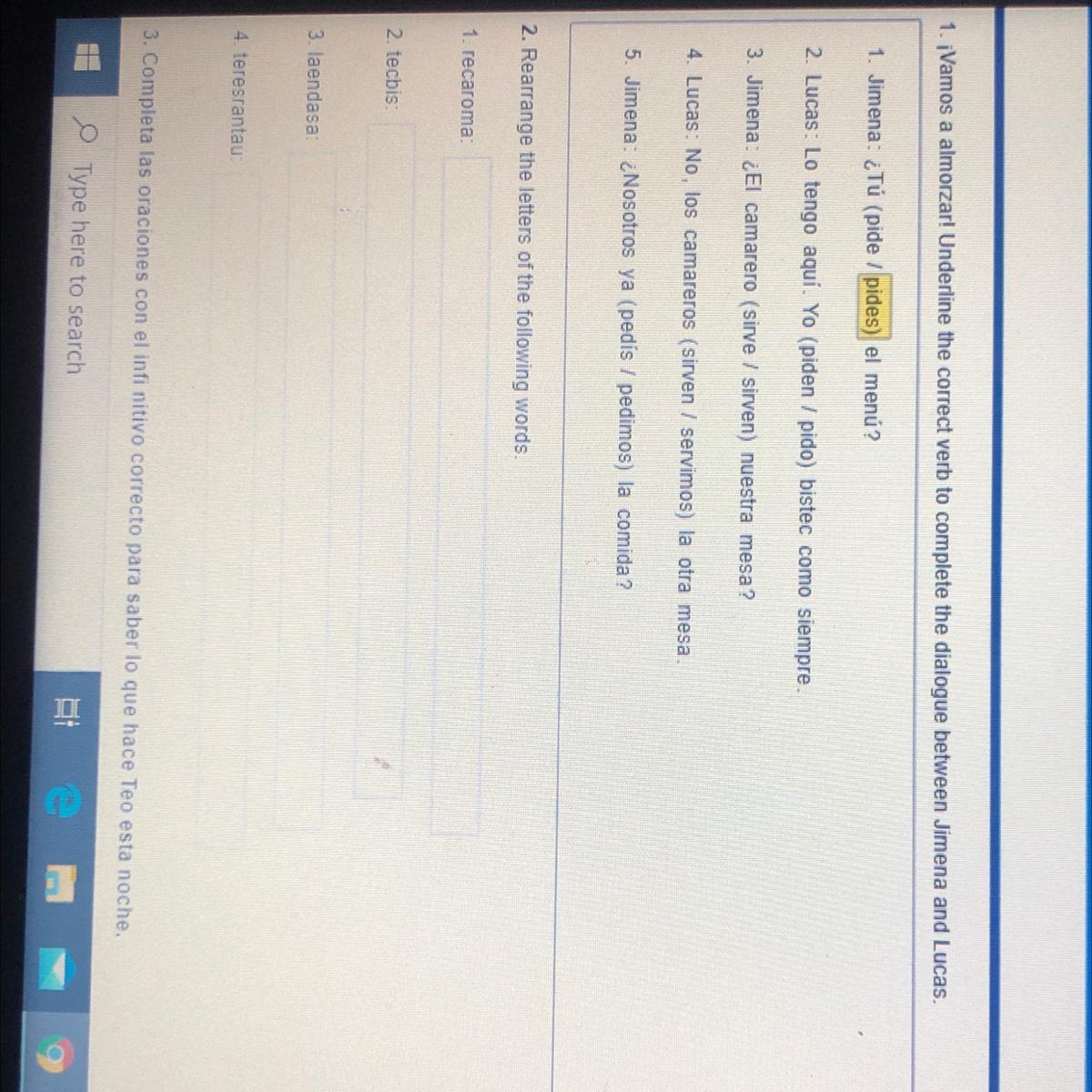 Underline the correct verb to complete the dialogue between Jimena and Lucas and rearrange the letters of the following words .